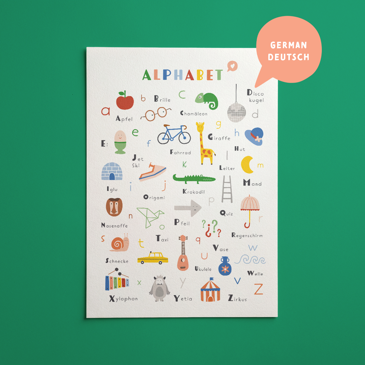 A beautiful Alphabet print featuring a collection of lovely, colorful and cheeky illustrations from Apfel to Zircus. This cheery alphabetical gang wants to keep you company in any room of the house! It will brighten up the decor in your babies nursery, kid’s room or play room! From now on you can have fun learning the letters with your little one!